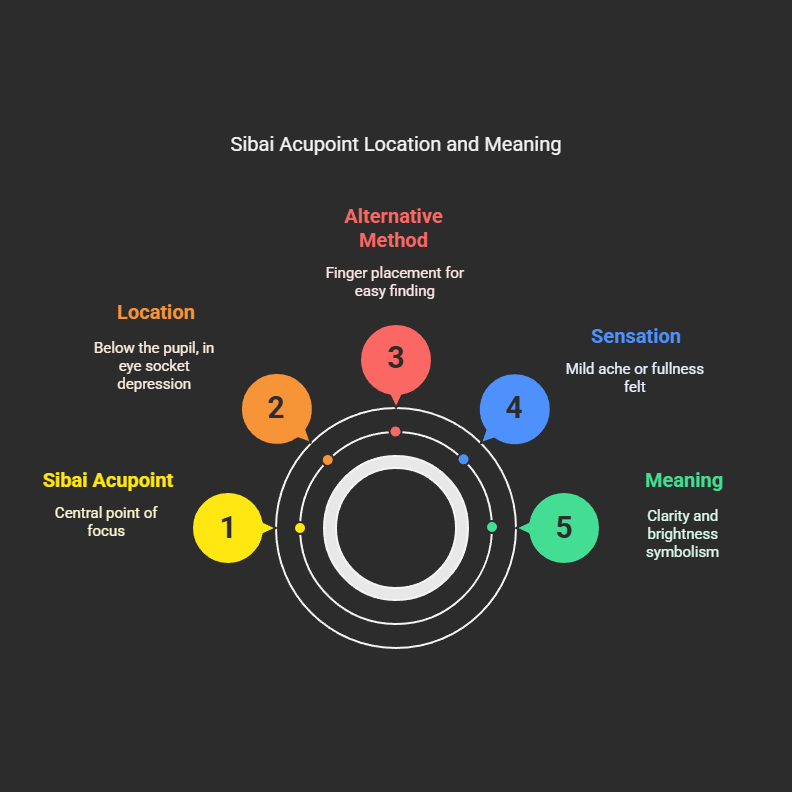 Now, let's get to know the main subject of this article – the Sibai acupoint (ST2). Accurately locating the Sibai acupoint is actually very simple.When your eyes are looking straight ahead, the Sibai acupoint is found directly below the pupil, in a small depression you can feel on the lower rim of your eye socket (the infraorbital ridge). This is also the location of the infraorbital foramen.An alternative, more convenient method is this: place your middle and index fingers together and lightly rest the side of your middle finger against the wing of your nose (ala nasi). The tip of your index finger will then usually fall naturally on or very near the Sibai acupoint. In this spot, you might feel a mild aching or full sensation, or a subtle depression.The name 'Sibai' itself poetically points to its primary functions. 'Si' (four) denotes the four cardinal directions, representing all directions or the space around the acupoint; 'Bai' (white), on the other hand, signifies whiteness, clarity, and brightness.