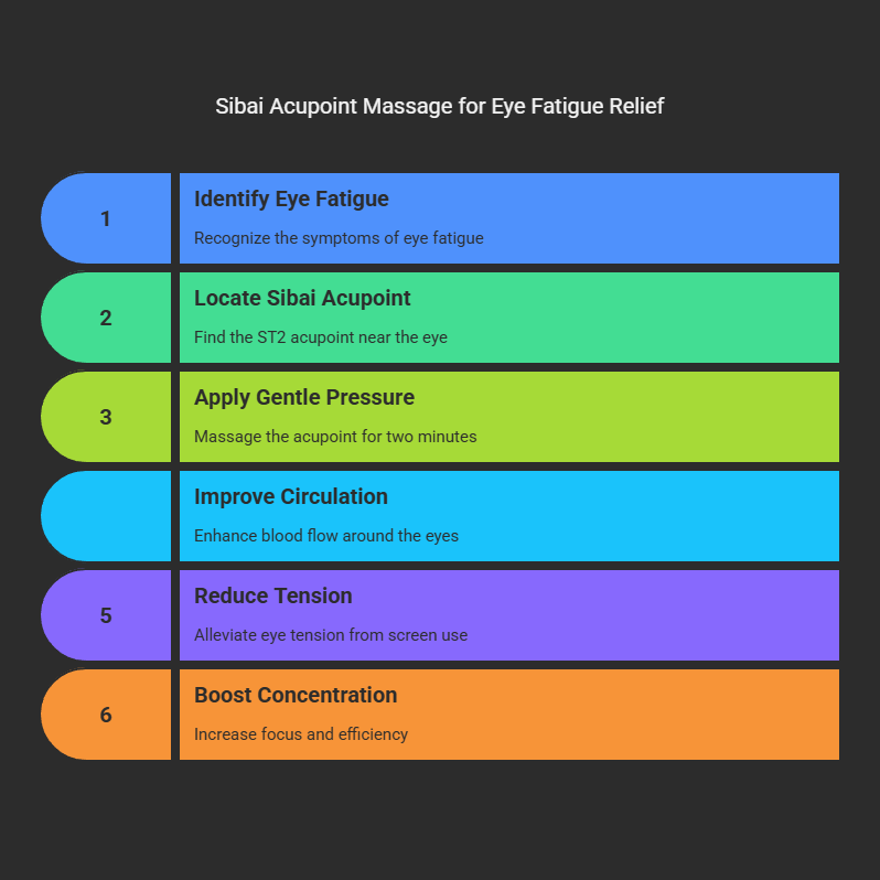 In today's digital age, where screens are ever-present, eye fatigue has become an almost universal affliction for many of us. Cleverly incorporating short and effective massage of the Sibai acupoint (ST2) into your work or study breaks is an excellent self-care method.Just two minutes of gentle pressure on the Sibai acupoint can help quickly revive tired eyes, effectively improve circulation around the eye area, and significantly reduce the sensation of tension that comes from prolonged screen use. Think of it as giving your eyes a mini 'reset' or 'recharge'. This can help to counteract the negative effects of staring at digital screens for extended periods and may even, to some degree, boost your subsequent concentration and efficiency in work or study.