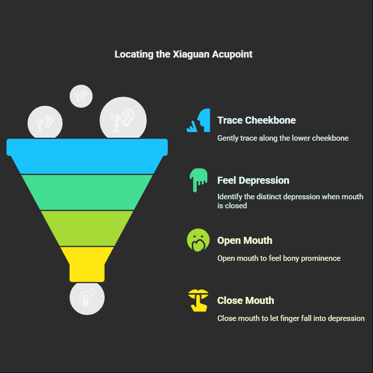 To experience the benefits of the Xiaguan acupoint, accurate location is the first step. You can try this method: Face a mirror. Using your finger(s), gently trace downwards from directly in front of your ear, along the lower edge of your cheekbone. When you close your mouth, you will feel a distinct depression at the lower border of the cheekbone. This is the Xiaguan acupoint.Another technique is: First, open your mouth. You will feel a bony prominence in front of your ear (this is the condylar process of the mandible). Place your finger on this prominence. Then, slowly close your mouth, and your finger will naturally fall into a depression. This is the Xiaguan acupoint. Remember, "locating the point with the mouth closed" (閉口取穴, bìkǒu qǔ xué) is key, as this positions the acupoint in the most suitable state for stimulation and regulation.