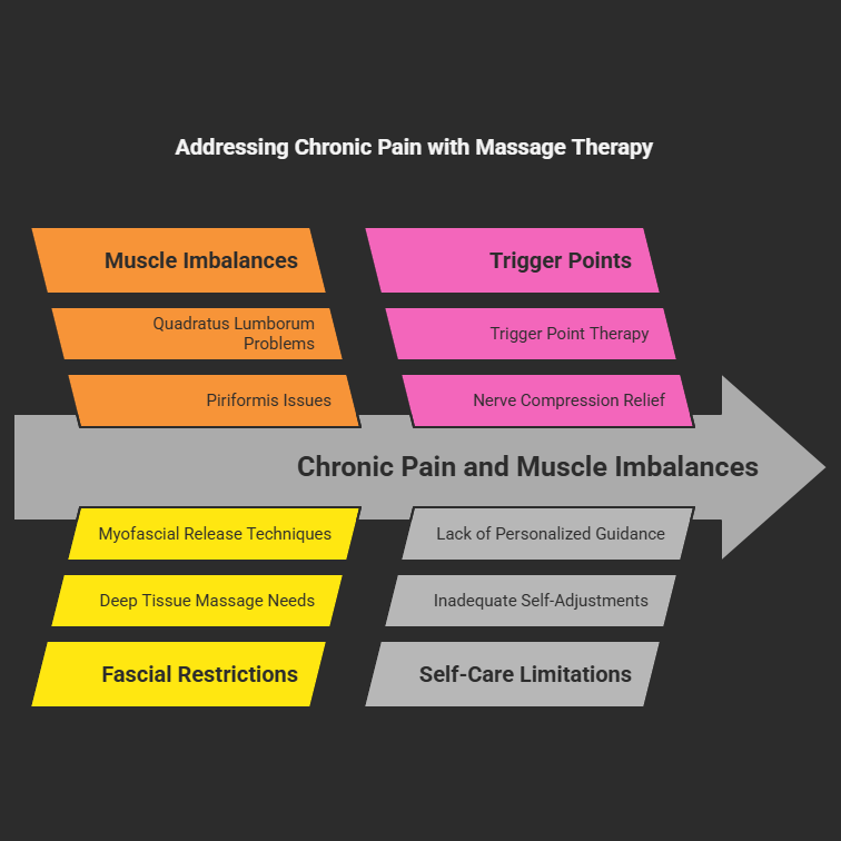 When self-adjustments provide limited results, or if your pain is quite severe, seeking help from a professional massage therapist is a wise choice. Through a professional assessment, we can precisely identify your specific muscle imbalances, areas of fascial restriction, and trigger points.By employing techniques such as deep tissue massage, myofascial release, and trigger point therapy, we can effectively release 'problem muscles' like the piriformis and quadratus lumborum, relieve nerve compression, and help your pelvis return to a neutral position.Massage therapy not only provides deep relaxation and relief but can also break the vicious cycle of pain and offer personalized home exercise guidance, making your self-care efforts safer and more effective.