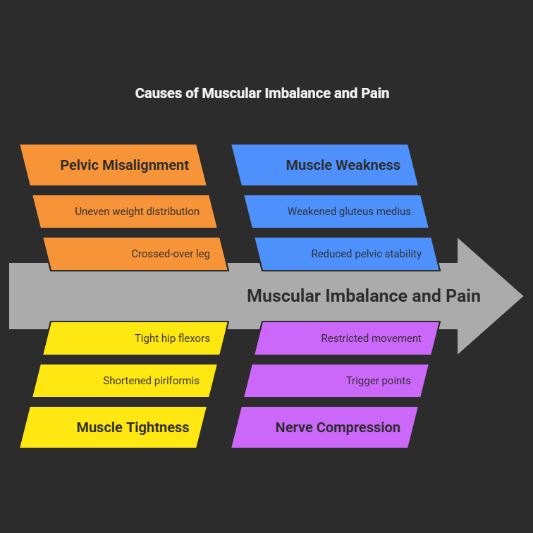 The misalignment of the pelvis and spine directly leads to an imbalance in the muscles on both sides of the body. Imagine a never-ending tug-of-war: On the side of the crossed-over leg, your piriformis, hip flexors, and adductors remain in a shortened, tightened state for extended periods, like ropes being constantly pulled taut.Meanwhile, on the other side, stabilizing muscles such as the gluteus medius can become lengthened and weakened, losing their power to stabilize the pelvis. This pattern of 'tightness versus weakness' is precisely the root cause of much pain. Tight muscles can develop trigger points, restrict movement, and even compress nerves; conversely, weak muscles cannot provide adequate support, thus increasing the risk of injury