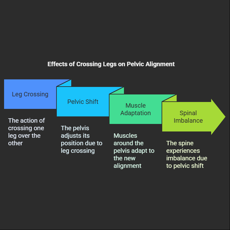 When you cross one leg over the other, the change begins right at the body's core – the pelvis. Imagine the pelvis as the foundation of a building; crossing your legs is like making that foundation higher on one side and lower on the other.The side of the pelvis with the upper leg is passively raised and may rotate backward, while the side with the lower leg is lowered in comparison, causing the pelvis to tilt and twist. This seemingly minor change, however, is the first domino in a chain reaction of bodily imbalance.Over time, the muscles surrounding the pelvis adapt to this misalignment; deep stabilizing muscles experience uneven stress, and ligaments endure asymmetrical tension. They gradually 'get used to' this incorrect position, setting the stage for future spinal problems.