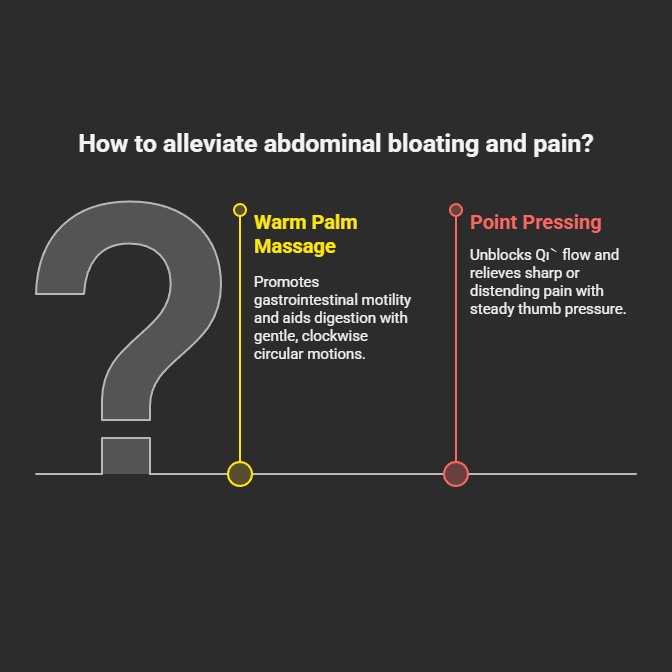 Abdominal bloating and pain – whether caused by overeating, indigestion, or emotional tension – are common issues for many people. Here, too, the Tianshu acupoint can be put to good use.About an hour after a meal, it's recommended to use warm palms to perform large, **clockwise** (順時針) circular massages over your abdomen, centering the movement around the Tianshu points. The pressure should be gentle, aiming simply for a feeling of warmth and comfort in the abdomen. This helps to promote gastrointestinal motility and aid digestion.If you are experiencing distending pain ($zhàng tòng$ - 脹痛) or a sharp, stabbing pain ($cì tòng$ - 刺痛) due to impeded $Qì$ flow, you can try the "point pressing" method ($diǎn àn fǎ$ - 點按法): Use your thumb tip to apply steady pressure directly onto the Tianshu point until you feel a noticeable sensation of achiness and distension ($suān zhàng$ - 酸脹感). Hold this pressure for several tens of seconds before slowly releasing. Repeat this process a few times. This technique helps to "unblock the $Qì$ dynamics" ($shūtōng qì jī$ - 疏通氣機) and relieve the pain.