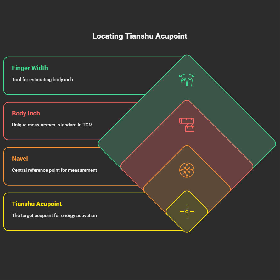 To activate the energy of the Tianshu acupoint (天樞穴), the first step is to locate it accurately. Don't worry, this isn't complicated.The Tianshu acupoint is situated on either side of your navel (also known as the Shenque acupoint - 神闕穴), at a horizontal distance of about 2 cun (寸). The "cun" used here isn't the standard centimeter or inch we often use. Instead, it's the unique "body inch" (t o ˊ ngsh e ˉ nc u ˋ n - 同身寸) from Traditional Chinese Medicine, which uses your own body's proportions as the standard.Here’s a simple method to find it: Place your index, middle, and ring fingers together. The combined width of these three fingers is approximately 2 cun. You can align the edge of your ring finger with one side of your navel; the spot that aligns with the outer edge of your index finger is where the Tianshu acupoint is located.Remember, there is one point on each side – left and right.