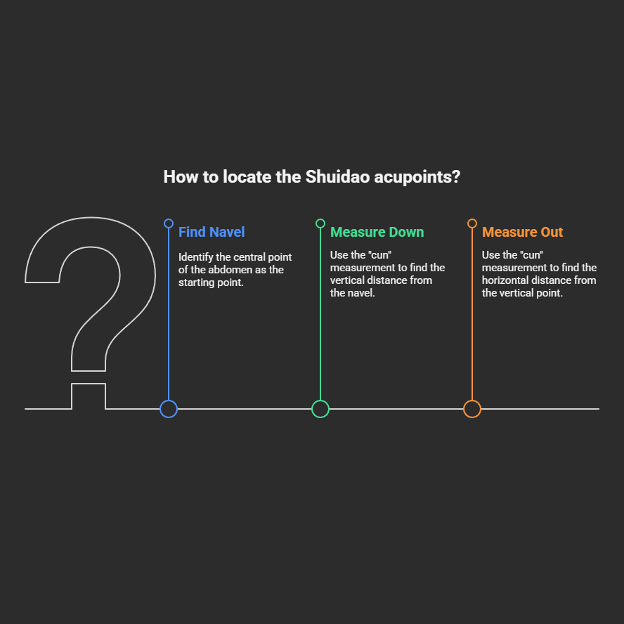 The very process of finding acupoints is a dialogue with your body, one that requires both patience and sensitivity. To locate the Shuidao point accurately, I recommend finding a quiet moment, lying comfortably on your back, and allowing your abdominal muscles to fully relax.Here's how to find it:1. **Find Your Navel:** First, identify the central point of your abdomen: your navel (also known as the Shenque point - 神闕穴). 2. **Understand "Cun":** We will use the unique "body inch" ($tóng shēn cùn$ - 同身寸) measurement from TCM, which uses *your own* hand for proportion. 3. **Measure Down (3 Cun):** Place your index finger, middle finger, ring finger, and little finger together. Their combined width equals approximately 3 *cun*. Measure this 3 *cun* distance straight down (vertically) from the center of your navel. Mark this spot mentally. 4. **Measure Out (2 Cun):** Now, place your index, middle, and ring fingers together. Their combined width is about 2 *cun*. 5. **Locate Shuidao:** From that spot 3 *cun* below your navel (found in step 3), measure 2 *cun* horizontally out to the left and 2 *cun* out to the right.These two points are your **Shuidao (ST28)** acupoints. They are symmetrical, with one on each side.