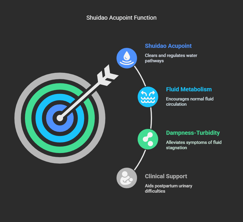 The primary function of the Shuidao acupoint, true to its name ("Water Pathway"), is to "clear and regulate the water pathways" ($tōng diào shuǐdào$ - 通調水道) of the body.When fluid metabolism within the body is sluggish or blocked, it can easily lead to the formation of what Traditional Chinese Medicine (TCM) terms **"Dampness-Turbidity" ($shī zhuó$ - 濕濁)**. This can manifest as symptoms like:* Lower body edema (swelling) * A sensation of abdominal fullness or bloating * Difficulties with urination (e.g., infrequent, hesitant, or uncomfortable)If you frequently experience heavy legs, abdominal bloating, or difficulty urinating, regular massage of the Shuidao points acts like clearing out your body's internal drainage system. It effectively encourages the normal circulation and elimination of fluids.Furthermore, numerous clinical observations indicate that massaging Shuidao can provide substantial positive support for postpartum urinary difficulties, helping the body regain its balance more rapidly.