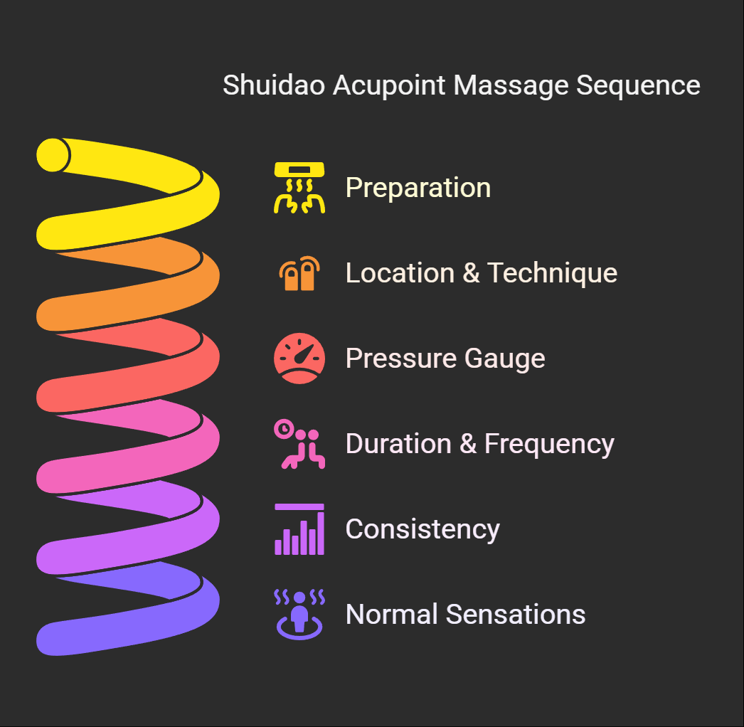 The best time to perform Shuidao acupoint massage is in a calm and relaxing environment.1. **Preparation:** Lie down comfortably on your back and rub your hands together until they feel warm. 2. **Location & Technique:** Place your warm finger pads on the Shuidao points, located on both your left and right sides. Using moderate pressure, perform gentle, circular rubbing motions. 3. **Pressure Gauge:** Remember, the goal is to apply enough pressure to feel the **"Deqi"** sensation – a mild achiness or feeling of fullness ($suān zhàng$) – but **never** enough to cause pain. 4. **Duration & Frequency:** It's recommended to massage each side for 2 to 3 minutes. You can do this once or twice daily, for instance, once in the morning and once in the evening. 5. **Consistency:** Consistency ($chí zhī yǐ héng$ - 持之以恆) is crucial. Aim to integrate this simple action into your daily life, making it a regular health habit, much like brushing your teeth. 6. **Normal Sensations:** During or after the massage, you might notice a feeling of warmth in your abdomen or an urge to urinate – these are perfectly normal and positive signs.