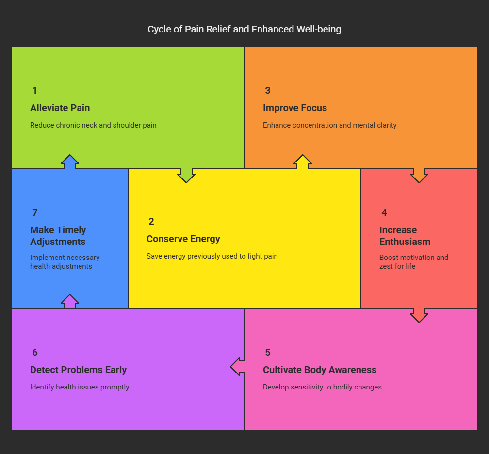 Ultimately, when chronic neck and shoulder pain is alleviated, the body no longer needs to expend significant energy 'fighting' or 'suppressing' discomfort. This 'saved' energy can then be converted into better focus and greater enthusiasm for life. Regularly performing stretches, paying attention to posture, and relaxing at appropriate times—these are not just self-care behaviors; more importantly, they cultivate a crucial 'body awareness.' This sensitivity to subtle changes in the body allows us to detect problems earlier and make timely adjustments, thereby firmly taking the initiative for our own health into our own hands.
