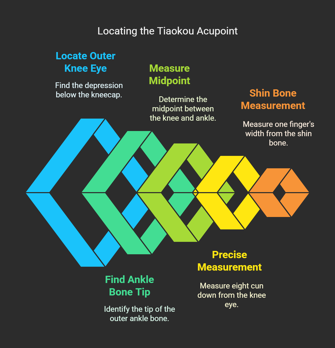 Now, let's find this amazing acupoint together! Please sit comfortably and rest one foot on the opposite knee.First, locate the depression on the outer side just below your kneecap, commonly known as the "outer knee eye" (the acupoint Dubi, ST35). Next, find the tip of your outer ankle bone. The Tiaokou point lies at the midpoint of the line connecting these two landmarks.For a more precise method: from the "outer knee eye," measure straight down the length of your four fingers held together, twice (a distance of eight cun in TCM measurement). Then, from the front crest of your shin bone (the tibia), measure about one middle-finger's width to the outside.When you press this spot—especially if your shoulder is currently uncomfortable—you will typically feel a distinct sensation of soreness, numbness, fullness, or an ache. That's it! This feeling, known as "De Qi," is the body responding to your touch.