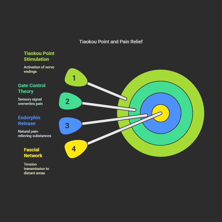 Interestingly, this ancient wisdom has also been validated by modern medicine. When we press the Tiaokou point, the nerve endings under the skin are activated. From a neuroscience perspective, this generates a benign sensory signal that can travel to our brain faster than the pain signal, effectively "overwriting" the sensation of pain. This is known as the "Gate Control Theory."At the same time, this stimulation can also prompt our brain to release natural pain-relieving substances—endorphins—bringing you a natural soothing effect.Furthermore, from the perspective of fascial science, the Tiaokou point is located within the tibialis anterior muscle. This muscle is part of the body's "Superficial Front Line" (a concept from myofascial meridians), and stimulating it can, through the transmission of tension across the entire fascial network, indirectly adjust the mechanical balance of the distant shoulder.