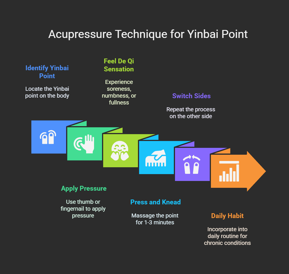Now, let's put theory into practice. The simplest method is acupoint pressing (acupressure).You can use the tip of your thumb or index fingernail to apply a steady, firm pressure to the Yinbai point. The ideal pressure is one that allows you to feel a unique sensation of "soreness, numbness, fullness, or an ache." In Traditional Chinese Medicine (TCM), this is known as "De Qi," which indicates the acupoint has been effectively activated.You can press and knead one side for about 1 to 3 minutes, and then switch to the other side. For chronic conditions, it is recommended to make this a daily habit, performing it once or twice a day. This simple action can be done while you're watching TV, taking a short break at the office, or even before bed. It is a form of self-healing that you can do anytime, anywhere.