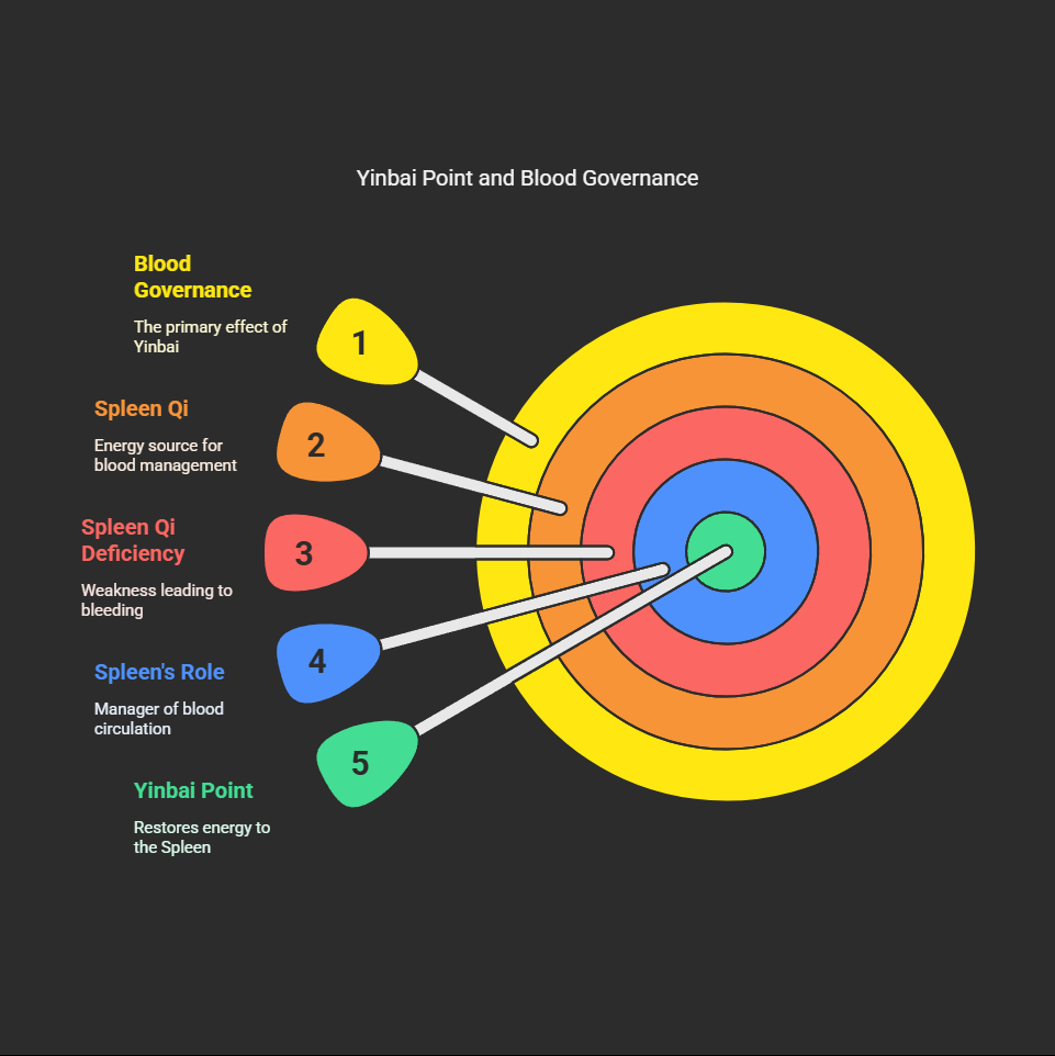 The most well-known and praised effect of the Yinbai point is its powerful ability to "govern the blood," making it what could be called the body's natural hemostatic agent. To understand this, we need to grasp a core concept in Traditional Chinese Medicine (TCM): "the Spleen governs the blood."You can imagine the Spleen (in the TCM sense) as a meticulous manager. One of its crucial duties is to ensure that blood circulates properly within the vessels and does not spill out. When this "manager" becomes weak due to overwork (a condition known as "Spleen Qi Deficiency"), its ability to restrain the blood diminishes, and various chronic bleeding problems can arise as a result.This is precisely where the Yinbai point shows its great strength. It can directly replenish energy for this fatigued "manager," strengthening its ability to contain the blood and thereby improving the issue.