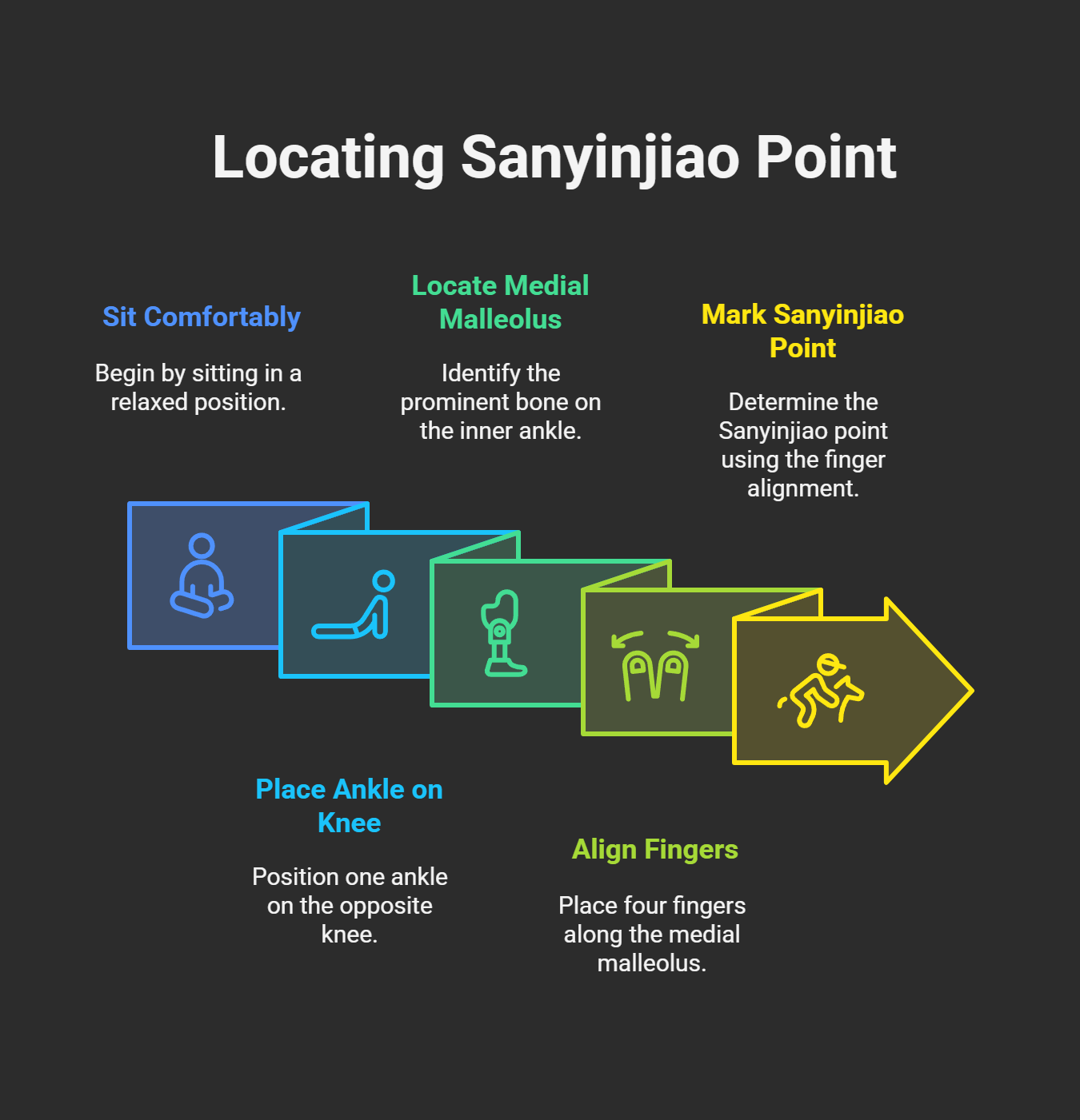 Before we can unleash the powerful potential of Sanyinjiao, the first step is to learn how to find it with precision. Accurate location is the key to ensuring its effectiveness.First, please sit comfortably and place the ankle of one foot onto your opposite knee, allowing the inner calf to completely relax. Next, locate the most prominent bone on the inside of your ankle; we call this the "tip of the medial malleolus."Place the four fingers of your other hand (from the index finger to the little finger) together. Align the edge of your little finger with the tip of the medial malleolus. The horizontal level marked by the upper edge of your index finger is the approximate location of the Sanyinjiao point. This "four-finger rule" is a very practical and universally applicable standard for measurement.