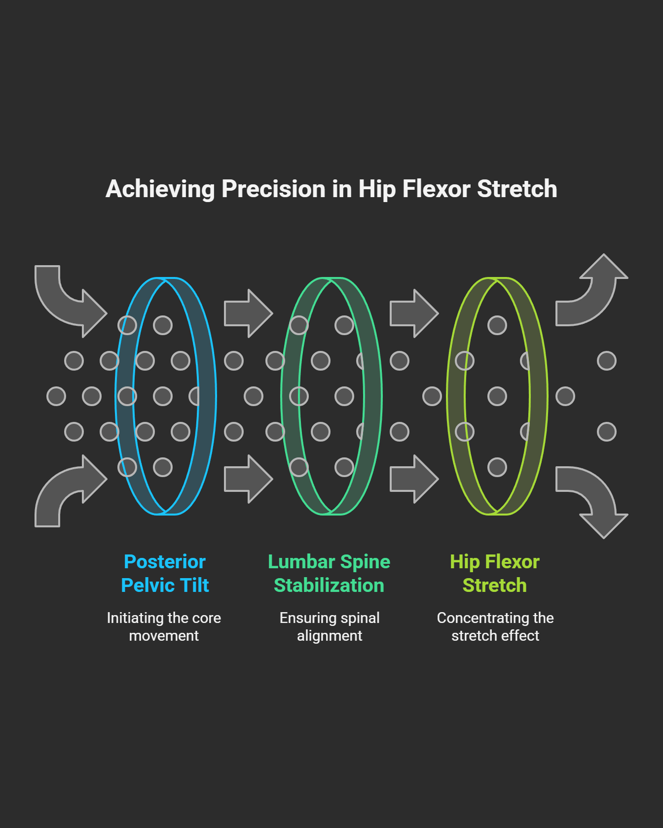 Among all hip flexor stretches, the kneeling stretch is the undisputed king because, when done correctly, it allows you to achieve the stretching effect with precision.First, assume a half-kneeling position with your front knee bent at a 90-degree angle, ensuring the knee is directly above the ankle. Before making any other movement, perform the most critical step: a posterior pelvic tilt. You can imagine this as "tucking your tailbone forward" or "gently squeezing the glute of your rear leg."This movement is the very soul of the entire stretch. It locks and stabilizes your lumbar spine, ensuring that the stretching force is concentrated on the hip flexors.