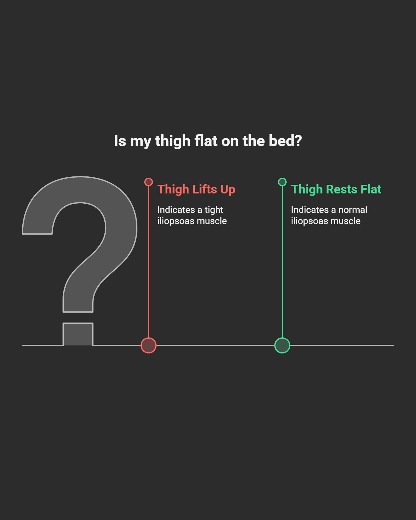 While maintaining the knee-to-chest position, observe the other leg that is hanging down naturally. Under normal circumstances, the thigh of the extended leg should be able to rest completely flat on the bed.If the thigh of your extended leg cannot rest flat and lifts up off the surface, this usually indicates that your iliopsoas muscle is tight. If your thigh can rest flat, but your lower leg does not hang straight down and instead extends forward, this may indicate that the rectus femoris muscle (part of the quadriceps) on the front of your thigh is too tight. This simple test provides objective clues to help you confirm where the problem lies.