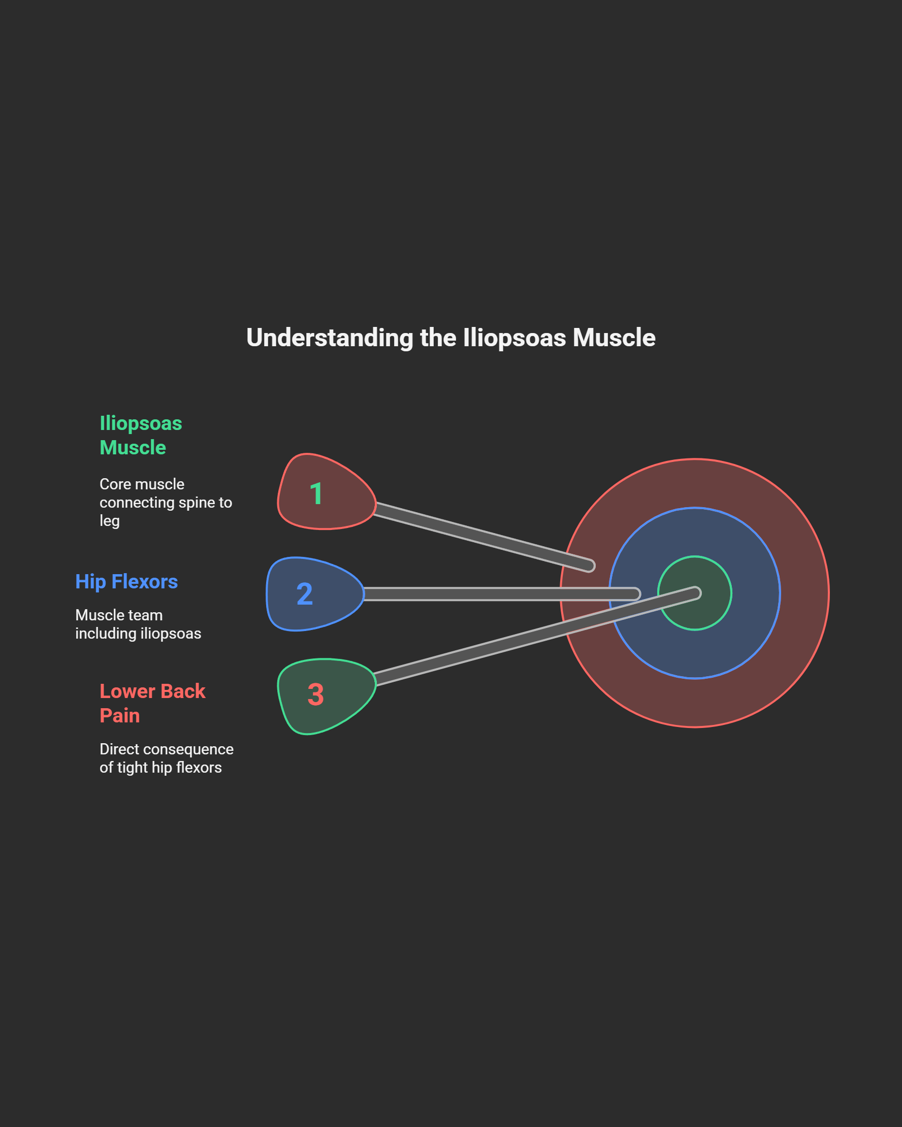 To solve a problem completely, we must first get to know it. The so-called "hip flexors" are not a single muscle, but a team that works in synergy, and the most important player on this team is the iliopsoas.This muscle is extremely unique. It originates from the vertebrae in your lower back, travels down through the deep abdominal cavity, and finally attaches to your thigh bone (femur). Remember this key fact: the iliopsoas is the only muscle that directly connects the spine to the leg. This direct anatomical link is the core to understanding why tight hip flexors directly cause lower back pain. It acts like a tightened cable, continuously pulling your lumbar spine forward.