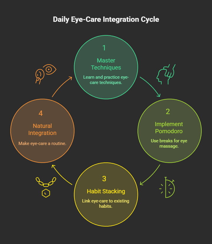 After mastering these powerful tools, the most crucial step is to seamlessly integrate them into your busy daily routine.You could try an "Acupoint Pomodoro Timer." During the 5-minute break you take after every 25 minutes of work, spend one or two of those minutes performing the massage.Alternatively, you can use "habit stacking" by linking this new habit to an old one. For example, do it every morning after you wake up, or in the interval while you're waiting for your coffee to brew. Let this eye-care routine become as natural a part of your life as brushing your teeth.