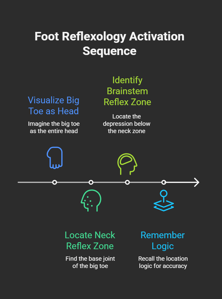 To activate this powerful mechanism, the first step is precise location. Imagine your foot is a GPS navigation system, and our destination is the key area at the junction of the head (the big toe) and the spine (the inner arch of the foot).First, visualize your big toe as your entire head.Next, find the base joint where the big toe connects to the ball of your foot. This is the reflex zone for the "neck" and serves as our first landmark.The reflex zone for the brainstem and cerebellum is located in a small depression on the sole-side of your foot, directly beneath this "neck" landmark. It is situated exactly between the base of the big toe and the upper part of the arch.Many charts mark this unclearly, but as long as you remember the logic—"just below the junction of the head and neck"—you won't get lost.
