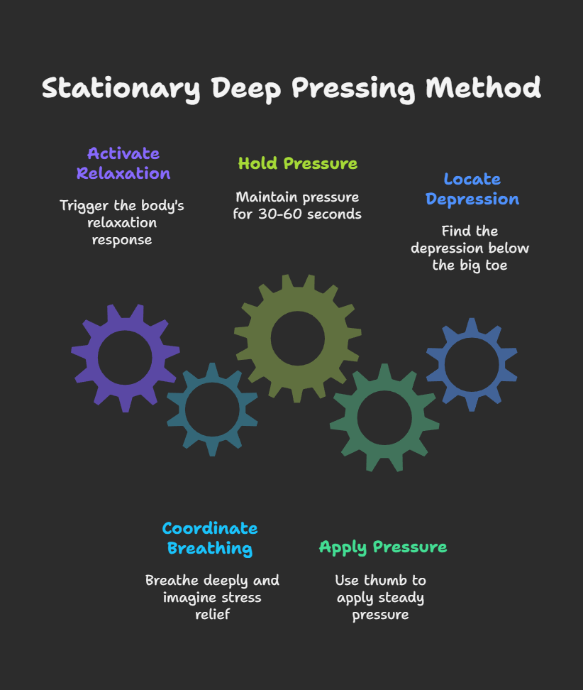 Next is Step Two, the "Stationary Deep Pressing Method," which sends a powerful signal to the core.In the depression you just located below the base of the big toe (the core of the cerebellum/brainstem reflex zone), use the tip of your thumb to apply a steady and deep pressure. Hold this for 30 to 60 seconds. The key is to apply a "sinking pressure"—a force that is focused and has a caring intention. The sensation should be a deep, sore fullness, not a sharp, piercing pain.During this time, coordinate with long, deep breaths, and imagine the stress dissipating with each exhalation. This action is equivalent to directly pressing the nervous system's "reset button," sending the most potent calming command to the brainstem and activating the body's relaxation response.