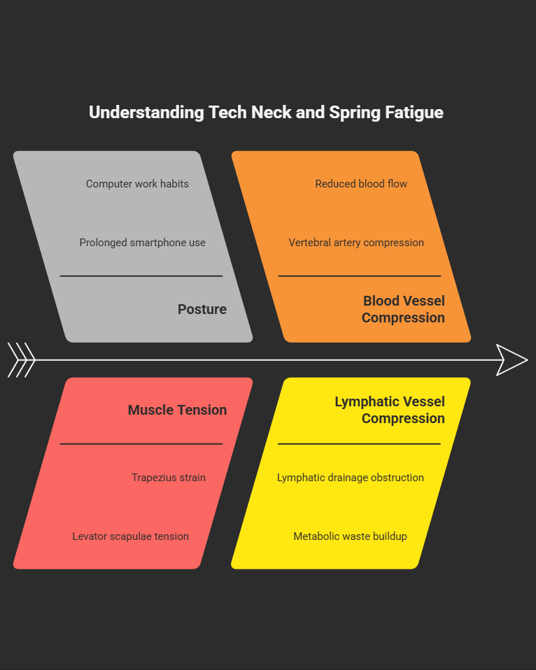 Having understood the traditional and modern perspectives, we must now confront a modern culprit that exacerbates spring fatigue—"tech neck."Prolonged periods spent looking down at smartphones and computers force our head and neck into an unnatural forward-leaning posture. This position compels the muscle groups at the back of the neck, such as the trapezius and levator scapulae, to remain constantly tensed in order to counteract the weight of the head.This chronic tension not only consumes a significant amount of the body's energy but, more critically, it also directly compresses the blood vessels (like the vertebral arteries) and lymphatic vessels that run through the cervical spine. This is equivalent to placing multiple physical roadblocks on the "cerebral highway"—where blood flow has already been slowed by seasonal adjustments. It further impedes the supply of blood and oxygen while also hindering the removal of metabolic waste, which only serves to make the feeling of brain fog even worse.